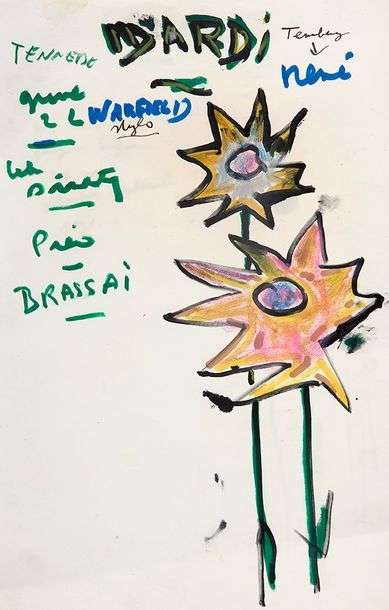 S.l.n.d., 1 page grand in-folio sur vélin Texte et dessin aux feutres noir et de couleurs avec rehauts de pastels gras, quelques annotations (plume et encre noire). Éphéméride pour un «mardi», où figure le nom de Brassaï et de René [Bertelé], illustré d'une grande composition à deux fleurs (340 x 150 mm).