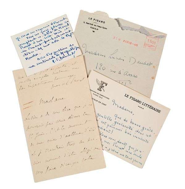 L'on joint la carte autographe signée de Mme Lucien Daudet offrant cette lettre à Maurice Noël, et la réponse de ce dernier (janvier 1950).