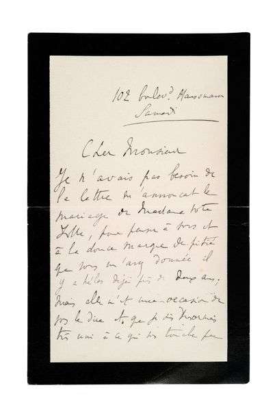 «Je n'avais pas besoin de la lettre m'annonçant le mariage de madame votre fille [Jacqueline Normand allait épouser le comte Bérenger de Miramon], pour penser à vous et à la douce maque de pitié que vous m'avez donnée il y a hélas déjà près de deux ans| mais elle m'est une occasion de vous le dire, et que je suis désormais très uni à ce qui vous touche par une fidèle et reconnaissante sympathie. Aussi ai-je été heureux d'apprendre que vous vivez ces jours de joie, et sûr aussi qu'hélas vous n'en sentez que plus cruellement l'absence de celle qui l'aurait si profondément éprouvée, et avec laquelle le partage vous eût été si doux [la mère de Jacques Normand est décédée en décembre 1904].»