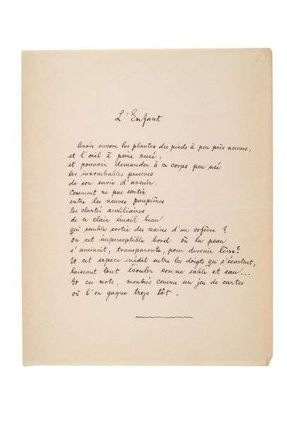 S.d., 1 page in-4 à l'encre «Avoir encore les plantes des pieds à peu près neuves et l'oeil à peine rusé et pouvoir demander à ce corps peu usé les innombrables preuves de son envie d'avenir ... comment ne pas sentir entre les neuves paupières les clartés auxiliaires de ce clair émail beau qui semble sortir des mains d'un orfèvre?»