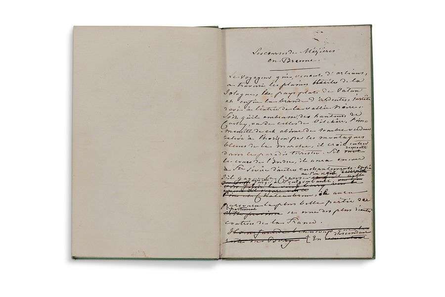 Les courses de Mézières-en-Brenne, manuscrit autographe signé [1846]. 20 pages et demie in-8 à l'encre brune, reliure cartonnage de papier vert avec pièces de titre.