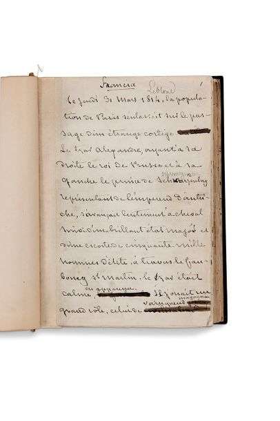 Avril 1871, fort grand in-8, 459 feuillets à l'encre montés sur onglets numérotés 1 à 447 (deux feuillets numérotés 293 et un feuillet 293 bis, les feuillets 343 à 447 ont été numérotés 333 à 447), au recto seulement sauf une indication de coupure à la fin de la première partie. Nombreuses ratures et ajouts. Reliure postérieure signée «PS» au contreplat, maroquin vert, dos à 5 nerfs orné, caissons ornés de fleurons dorés sur les plats, doublures et gardes moirées (premier plat détaché).
