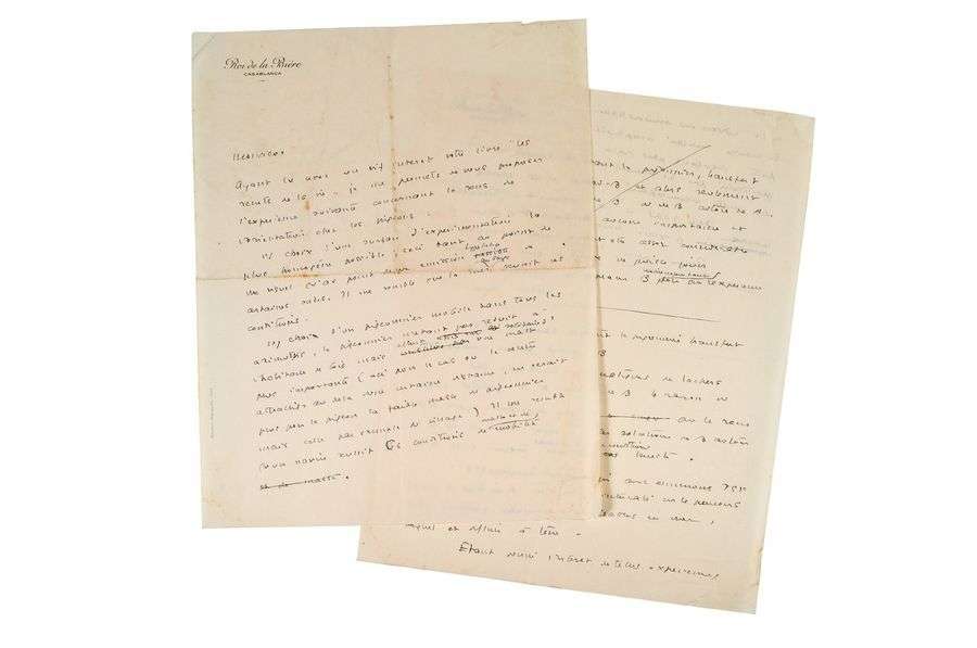 Brouillon de lettre sur des expériences de colombophilie [Casablanca], [vers 1927], 2 pages et quart in-4 à l'encre, à en-tête de la brasserie «Le Roi de la Bière».