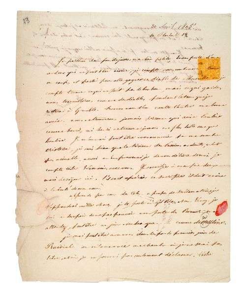 Pauline BEYLE [Paris], 10 floréal XIII [30 avril 1805], 1 page et quart in-4 à l'encre, adresse «Pauline». (Trace de colle et petite réparation).