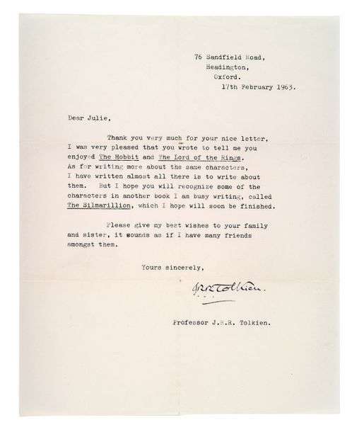 «Thank you very much for your nice letter. I was very pleased that you wrote to tell me you enjoyed The Hobbit and The Lord of the Rings. As for writing more about the same characters, I have written almost all there is to write about them. But