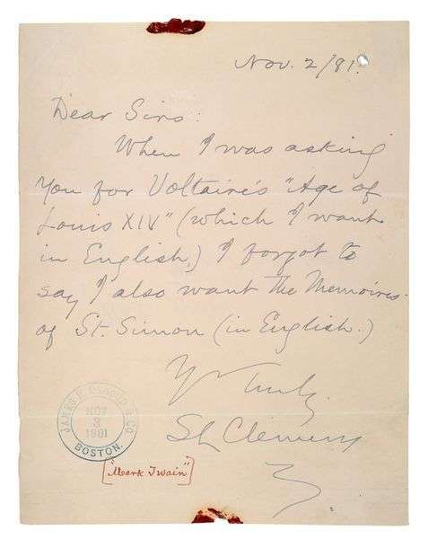 Lettre autographe signée «S. Clemens» par Mark Twain, célèbre auteur américain des Aventures de Tom Sawyer, à James R. Osgood & Co. à Boston, dans laquelle il précise qu'il souhaite posséder deux éditions en anglais de Voltaire et de Saint-Simon: «When I was asking you for Voltaire's ‘Age of Louis XIV' (which I want in English)
