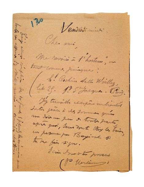 Lettre autographe signée de Paul Verlaine adressée à Edmond Lepelletier, ami d'enfance, journaliste et homme politique.