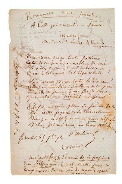 Extraordinaire document. Précieuse lettre comportant un superbe dessin original de Verlaine se représentant avec Arthur Rimbaud à Londres.