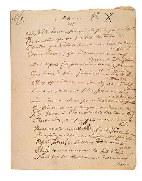 Manuscrit autographe corrigé, et seul connu, d'un très beau poème des Dédicaces, écrit pour sa maîtresse, Philomène