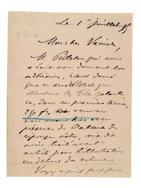 « Mon cher Vanier, M. Pelletan qui vous a écrit vous donnant son adhésion, étant donné que ce sera Willette qui illustrera les Fêtes Galantes, ce, dans ses premiers termes, 250 fr, est venu me voir avant-hier et en présence de l'absence de réponse vôtre, m'a dit avoir traité avec l'artiste pour l'illustration en dehors du volume. Voyez ce qu'il faut faire et conseillez-moi. Discrétion, n'est-ce pas ? Moi j'ai en devoir officieusement vous prévenir. C'est peut-être pressant. Je n'ai pas fait le sonnet pour Meurger. Ça commence à être obsédant tout ce bruit pour cette gloire modeste. Vous aurez en échange ma première "poésie fugitive". Au revoir bientôt. Moi toujours en chambre et bien vôtre. P. Verlaine. 16 rue St Victor. Réponse le plus vite possible je vous prie. ».