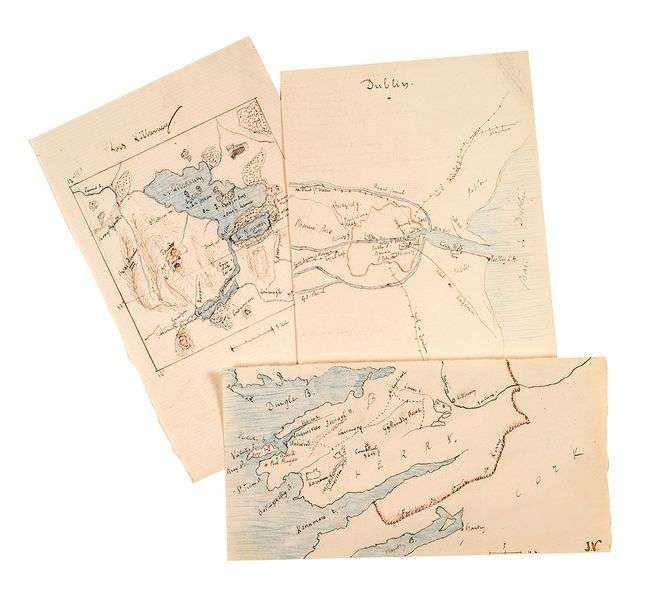 Rare ensemble de trois cartes de l'Irlande et de Dublin préparatoires à son roman P'tit Bonhomme (1893). Le roman, écrit en 1891, influencé par la lecture de Dickens, se déroule en Irlande, et conte l'histoire de «P'tit Bonhomme», un pauvre orphelin. Il fut publié dans le Magasin d'Éducation et de Récréation du 1er janvier au 31 décembre 1893, et parut en volume le 23 novembre 1893 dans la série des «Voyages extraordinaires», divisé en 2 parties: Premiers Pas et Dernières Étapes.