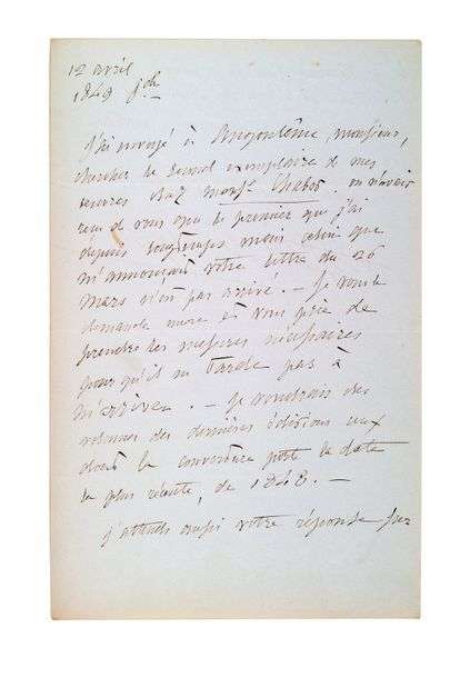 S.l., 12 avril 1849, 1 page et demie in-8 à l'encre sur papier bleu