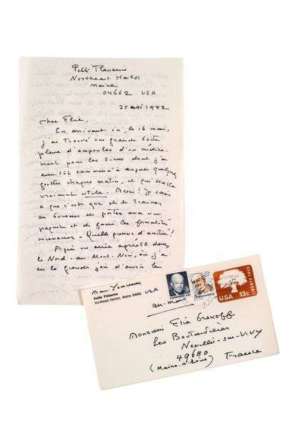 Lettre autographe signée au peintre Élie GREKOFF Petite Plaisance, Notheast Harbor, 25 mai 1982, 2 pages grand in-8 à l'encre, enveloppe autographe