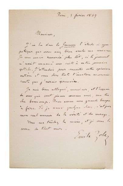 Émile Zola remercie le journaliste pour son aide. «Je suis bien attaqué et l'appui de ceux qui sont jeunes comme moi, me touche beaucoup. Nous avons une grande besogne à faire.»