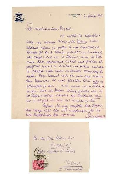 Vienne, 2 février 1912, en allemand, 1 page grand in-4 à l'encre, enveloppe conservée