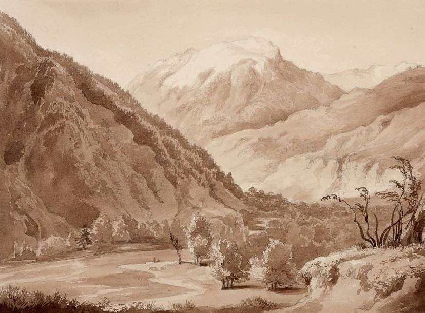 Situé et daté en bas à gauche Vue prise à st Jean de Maurienne 14 Mars 1828