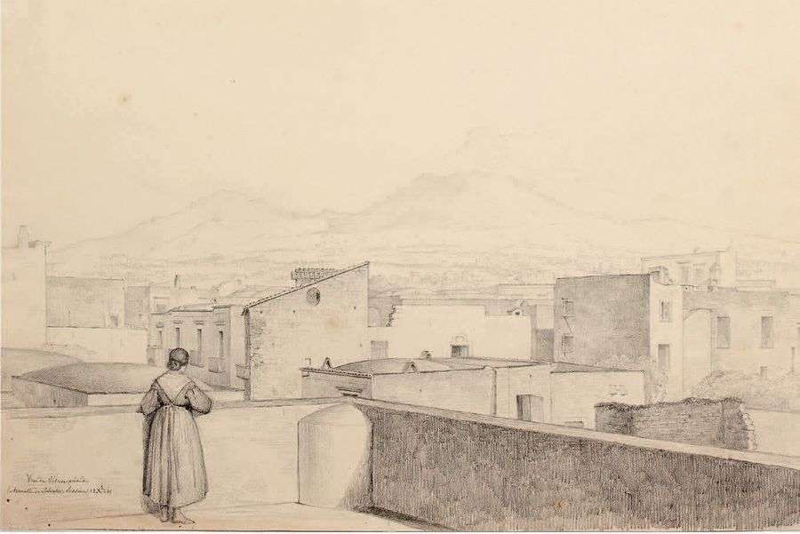 Joseph Frédéric Debacq dessine plusieurs vues du Vésuve, depuis le même point de vue, à seulement quelques jours d'intervalle. Cette pratique, qui connaîtra son heure de gloire avec les impressionnistes, révèle l'importance de la mise en scène de l'image. Il est en effet peu probable qu'une même femme se trouvait là lorsque l'architecte immortalisa cette scène. Le personnage, sûrement fictif, entre en contraste, par la rondeur des courbes de son chignon ou de ses manches, avec l'architecture géométrique et anguleuse des habitations traditionnelles ainsi qu'avec le relief naturel du volcan. La perspective fuyante créée par le mur de la terrasse dynamise la composition et pousse le spectateur à entrer dans la scène, comme le personnage de dos, typique de la Ruckenfigur romantique absorbée dans la contemplation du paysage, nous invite à la rejoindre.