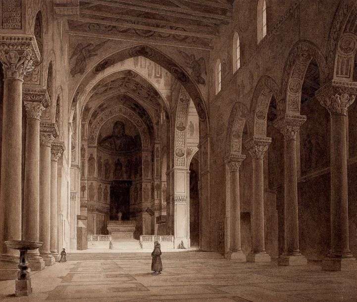La vue intérieure de la cathédrale de Monreale, chef-d'oeuvre de l'architecture médiévale du temps des Normands en Sicile, met en valeur la splendeur du monument. L'immensité de l'espace accentuée par la petite taille du personnage, la régularité des arcs, la perspective menant droit sur la mosaïque du Christ Pantocrator rendent le caractère époustouflant de l'endroit. La qualité des détails qui permettent de distinguer les décors donne l'illusion d'une image photographique.