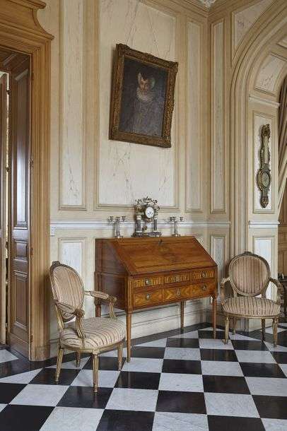 en bois marqueté ouvrant à 1 abattant et 4 tiroirs sur 2 rangs, les pieds fuselés