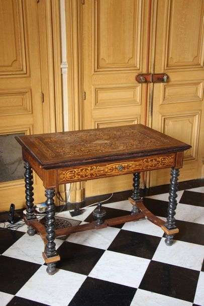 le plateau en bois marqueté de volutes, ouvrant à 1 tiroir en ceinture, piétement en bois noirci tourné avec entretoise en H surmontée d'un pot.