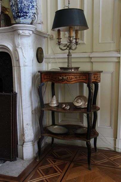 de forme violonée, en marqueterie contrastée de volutes et à décor de fleurs, ouvrant à un tiroir en ceinture, 2 tablettes d'entretoise