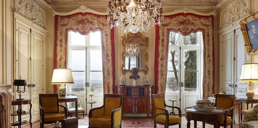 Paire de cantonnières en tapisserie à décor de guirlandes, feuillages fleuris sur fond framboise.
