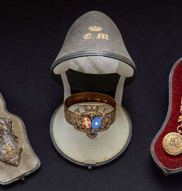 en or jaune 18k ciselé et émaillé et appliqué en son centre d'un motif représentant les armes de la famille