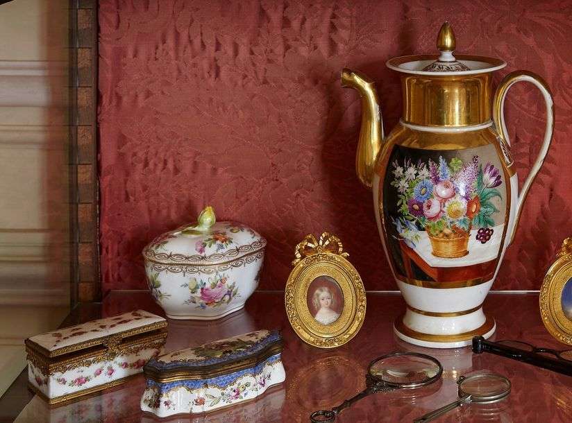 Avec ensemble de trois boites en porcelaine polychrome, monture en argent et bronze doré