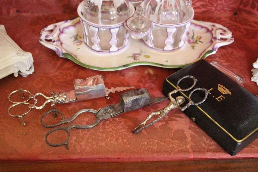 Ensemble de deux mouchettes et un ciseaux formé d'un arlequin avec son étui d'origine