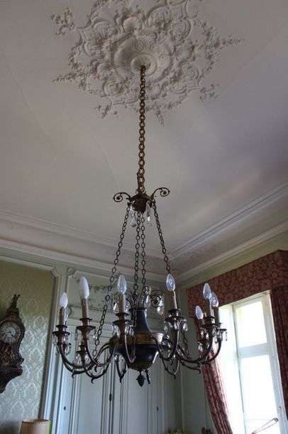 à douze bras de lumière en tôle laquée vert et bronze