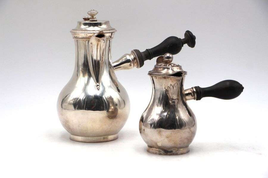 Deux chocolatières en argent, les manches en bois tournés. Poinçon Minerve