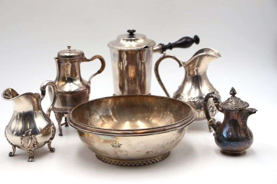 Ensemble en argent comprenant diverses verseuses, coupe, montures, casserole… Poinçon Minerve