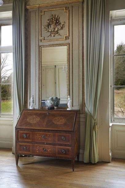 en bois mouluré sculpté doré et laqué céladon, le fronton à décor d'un bouquet.