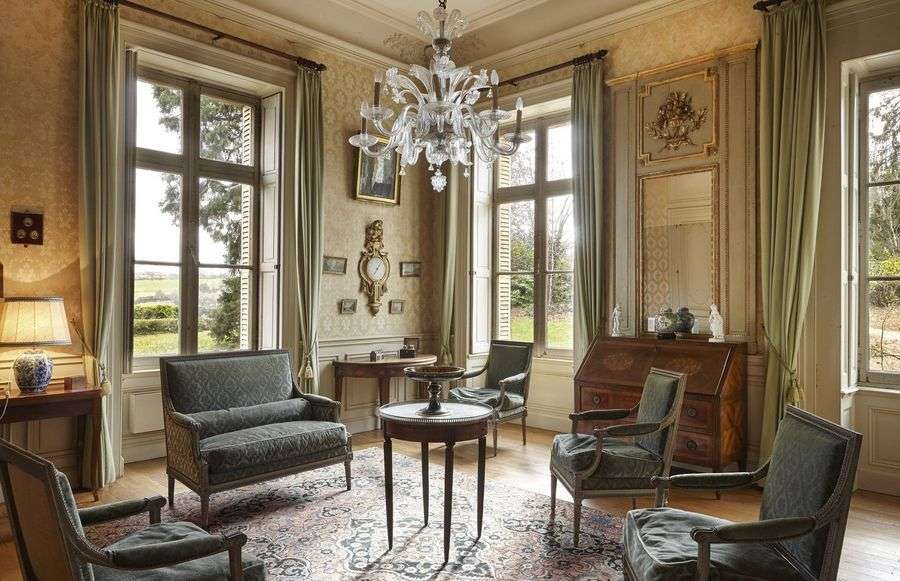 en bois mouluré sculpté et laqué vert à décor de raies de cœur et perles, le dossier droit, les accotoirs munis de manchettes, la ceinture droite et les pieds fuselés et cannelés (usures)