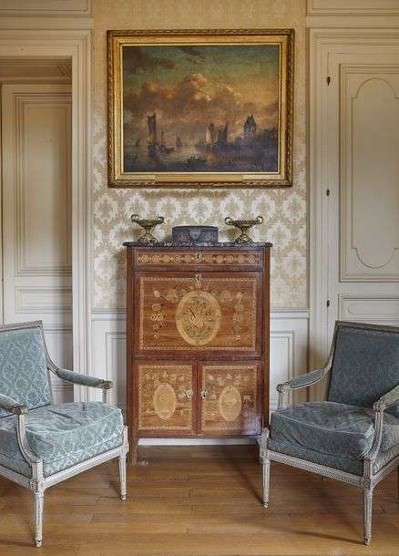 en marqueterie, ouvrant à un abattant, deux vantaux et un tiroir, décor aux attributs de la musique et guirlandes fleuries dans des cartouches, marbre gris de Sainte Anne.
