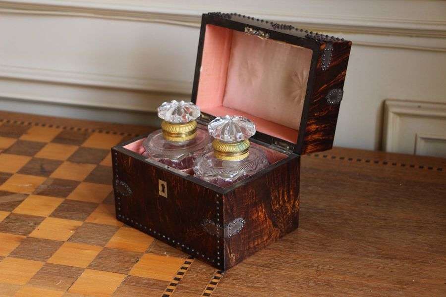 en bois clouté comprenant deux flacons en cristal