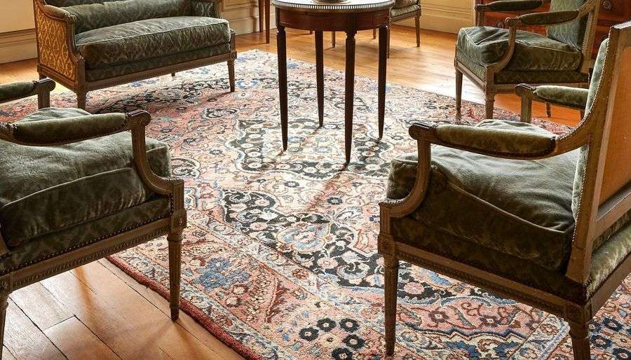 Grand tapis à champ rose à décor de rinceaux.