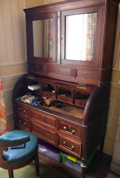 Bureau à cylindre en acajou et placage d'acajou avec partie supérieure à miroirs