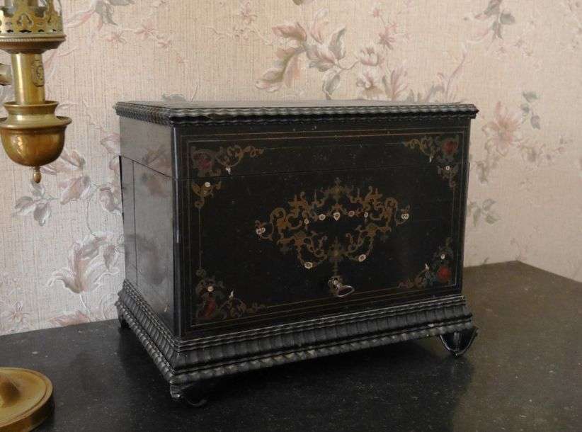 Cave à liqueur en bois noirci et incrustations de filets de laiton et nacr