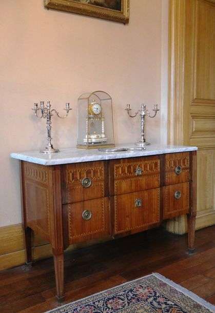 en marqueterie à ressaut central ouvrant à deux tiroirs sur deux rangs, les pieds fuselés, garniture de bronzes dorés, plateau de marbre blanc veiné gris