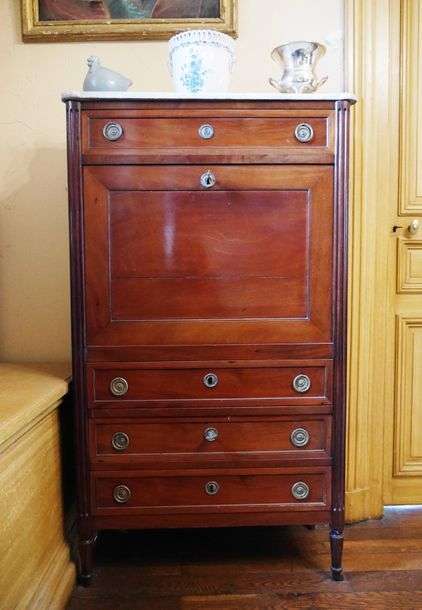 en acajou ouvrant à un abattant et quatre tiroir, les montants cannelés et pieds fuselés, dessus de marbre blanc veiné gris