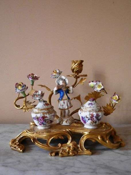 en porcelaine de Meissen polychrome et bronze doré figurant une joueuse de flûte dans un encadrement de fleurs
