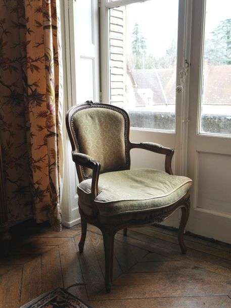 en bois naturel mouluré et sculpté de fleurettes, garniture en velours vert