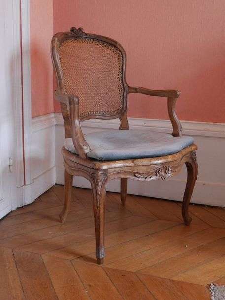 en bois naturel mouluré et sculpté, l'assise canné, avec sa galette en velours gris