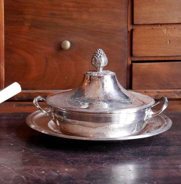 en argent ciselé, la prise formant pomme de pin, avec son présentoir