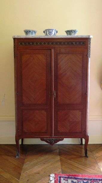 en marqueterie, ouvrant à deux portes, garniture de bronze doré, marbre blanc veiné