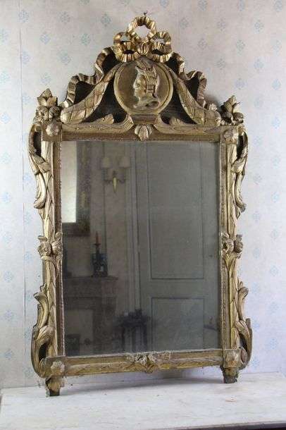 Miroir en bois sculpté et doré, le fronton à décor d'un profil de femme