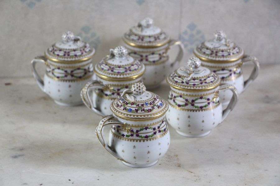 Suite de six pots à crèmes en porcelaine de Sèvres à décor floral et liser