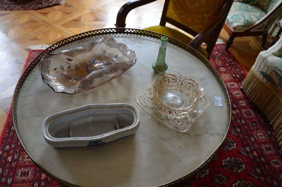 Ensemble de verrerie comprenant un petit vase à décor dégagé à l'acide floral, signé Daum Nancy, une coupe à bords retournés à décor émaillé signée Gallé, et un bol et son présentoir en verre à décor de rinceaux d'or