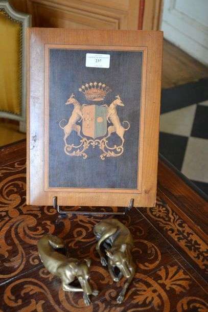Ensemble d'un porte document marqueté aux armoiries de la famille d'Espiès et deux petits sujets en bronze doré figurant des lévriers